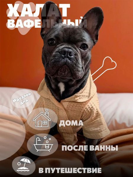 Материал: Натуральный хлопок (вафельное полотно). Плотность 220-240 г/м² обеспечивает оптимальную впитываемость и воздухопроницаемость. Халат мягко согревает, не давая собаке замерзнуть, и при этом позволяет коже дышать.