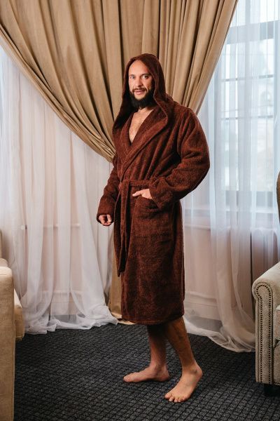 Модель халата с поясом позволяет ему быть универсальным и подходит к любому типу телосложения, скрывая недостатки и подчеркивая достоинства фигуры. Наличие карманов делает его практичным для ношения дома, в бане или сауне, а также на отдыхе.